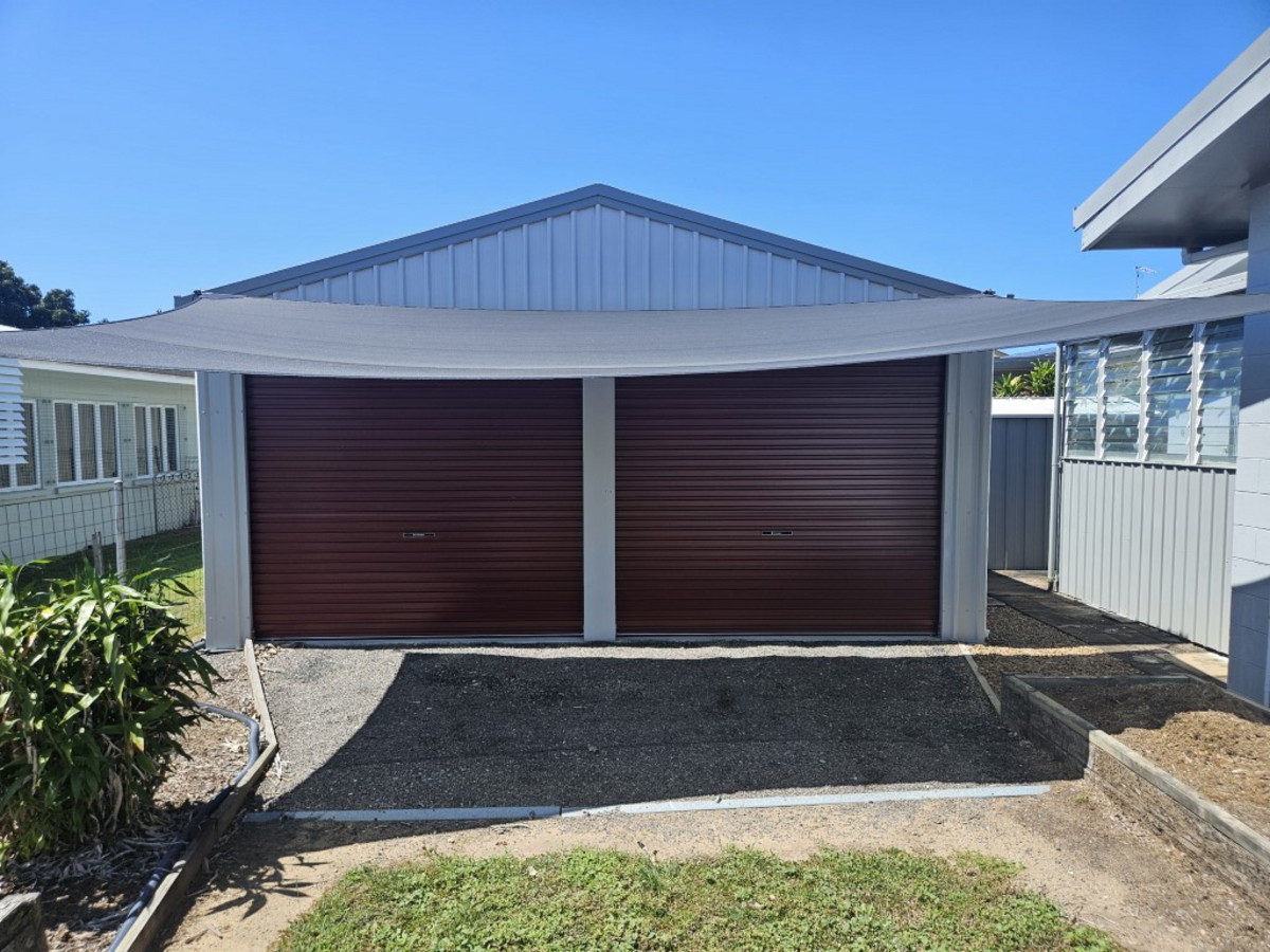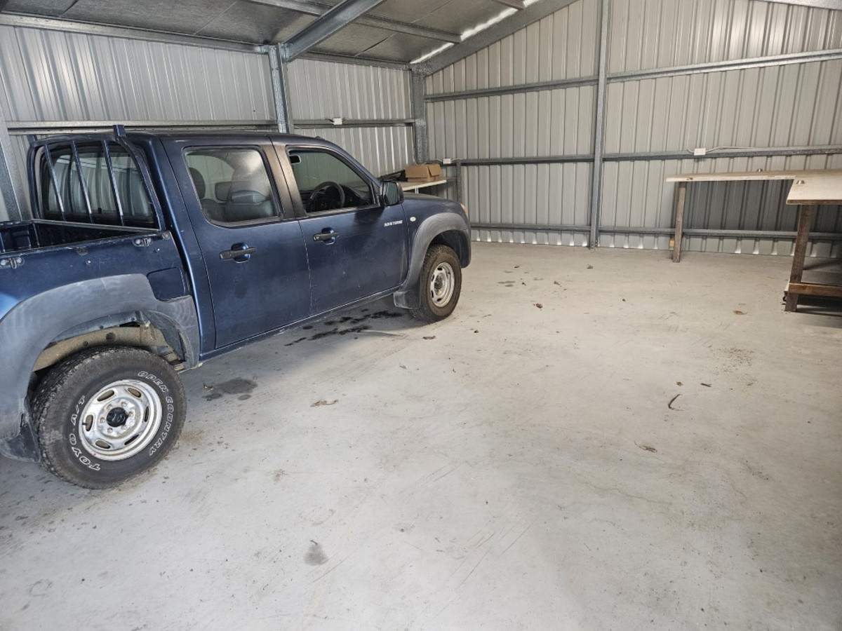 A single car garage with laundry area is attached to the house, while a 2 bay shed is located to one side of the house.